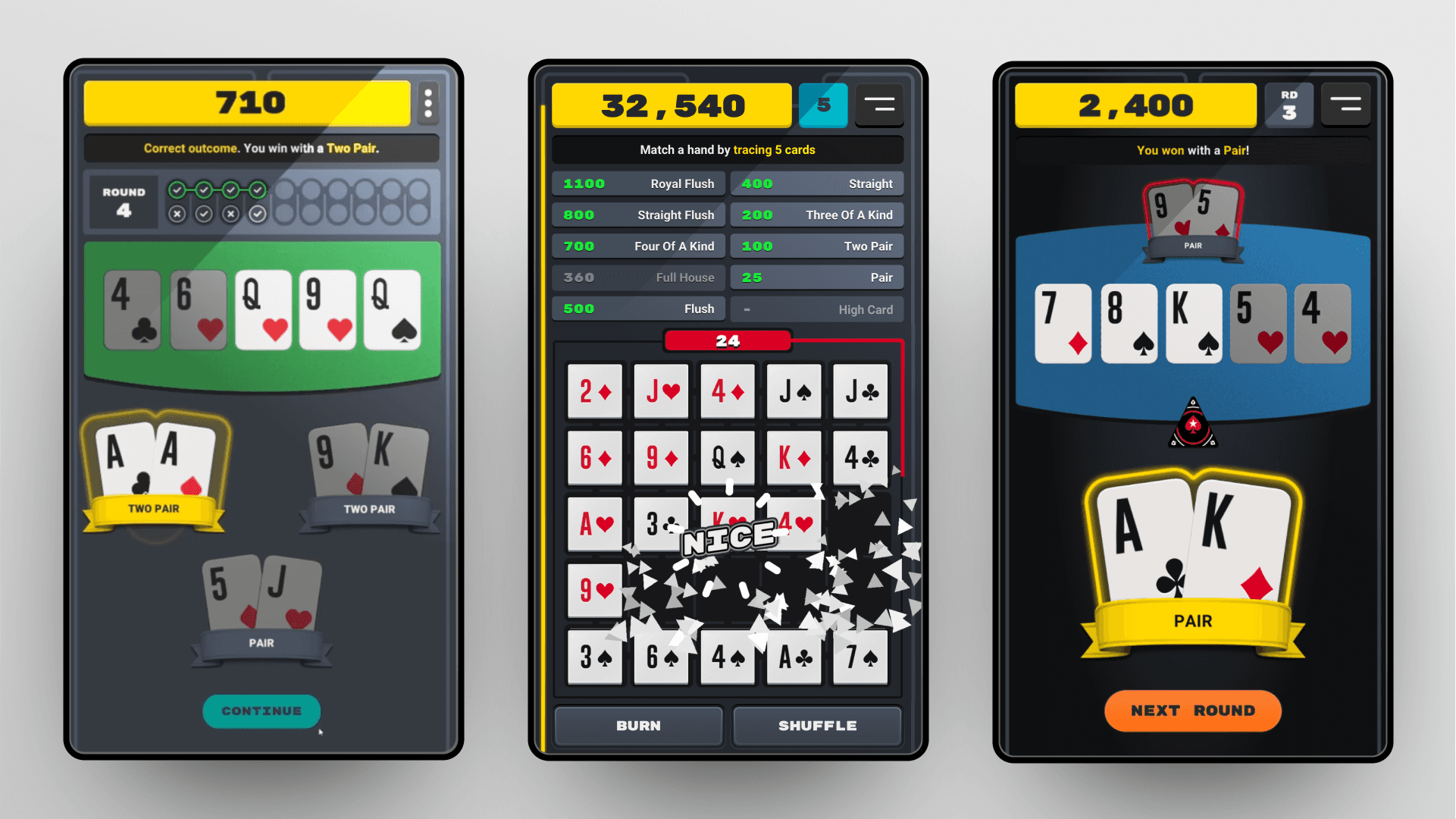 To address these challenges, we outlined three key points of focus: onboarding, gameplay and developing skills. For onboarding, we streamlined the sign-up flow, added an interactive tutorial with reward incentives and conducted heuristic evaluations to focus on improving the user journey. In-game, we redesigned the table experience with improved board and betting visibility, enhanced multi-table management and a portrait orientation for players on the go. To increase player potential, we created Poker Dojo, an educational app to introduce poker strategy through engaging mini-games. The results of our key focus areas allowed players a streamlined way of getting into a game and provided them with the confidence and skill to win.