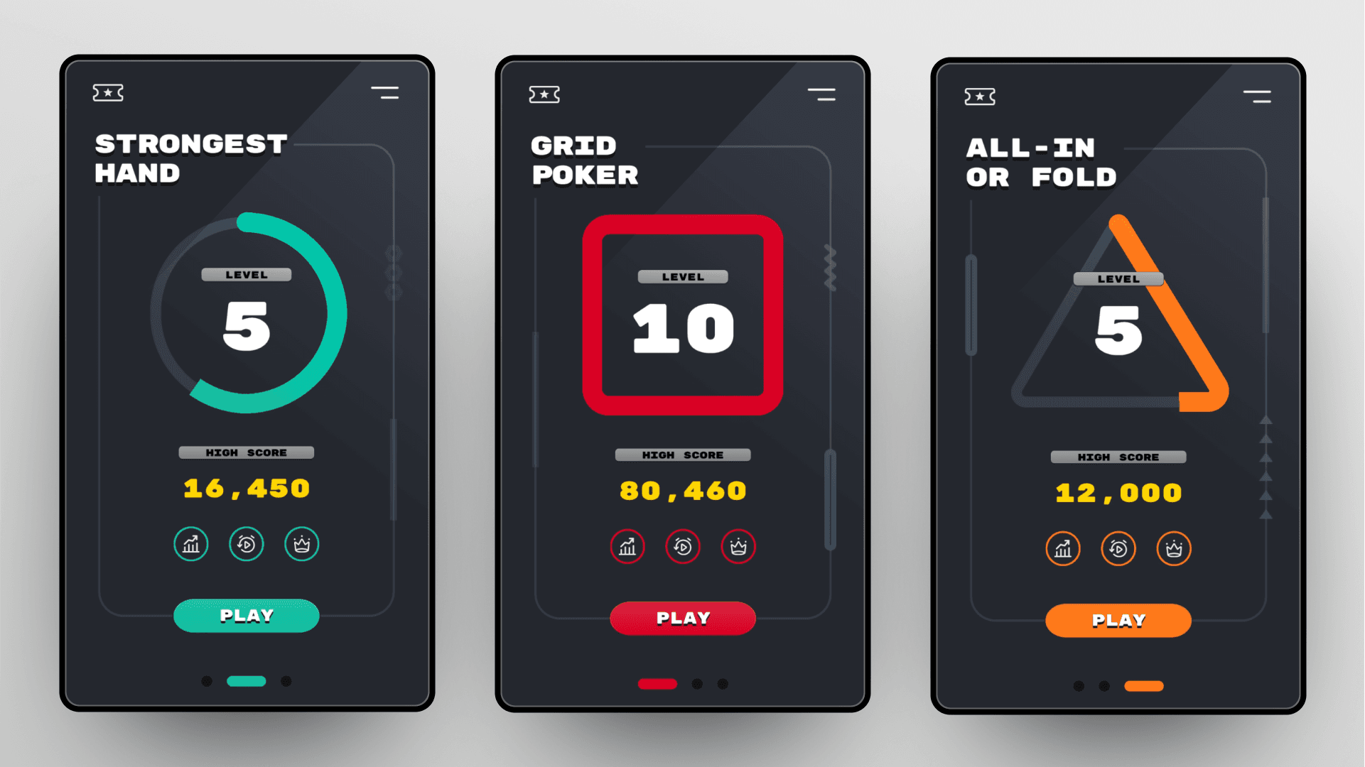 In poker, skilled players are able to spot novices and there was an opportunity to educate new players so they can increase their chance of winning. As part of a successful RFP, we outlined our ability to design and develop an app with several mini games that focuses on different aspects of poker. To gauge the product’s success, we started with a Proof of Concept—an alpha, that was used in testing. The positive results led to us defining our three games: Grid Poker, Strongest Hand and All-In or Fold and naming the app Poker Dojo.