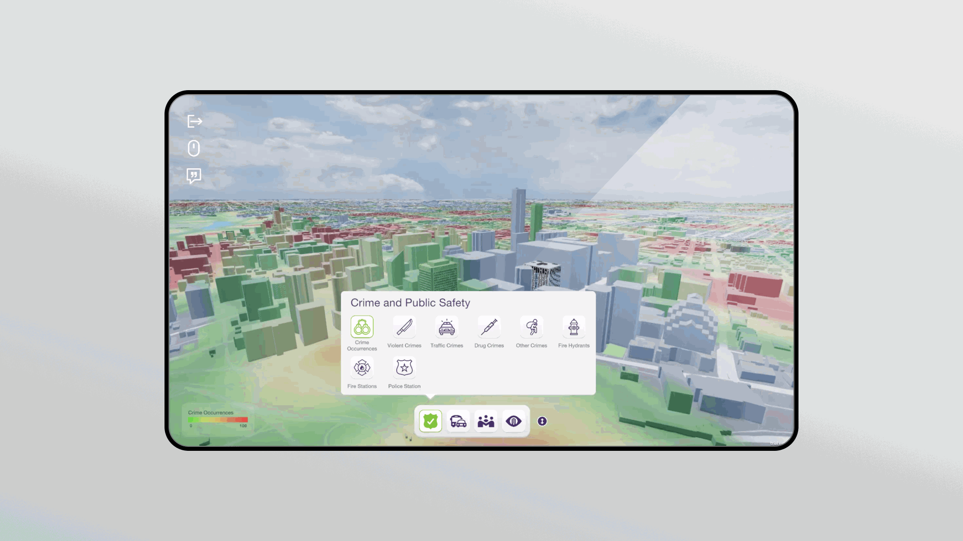 In an immersive experience, users are able to digitally freely roam around the city of Edmonton and toggle visually interesting data and information related to crime & public safety, transportation, communities and city vision.